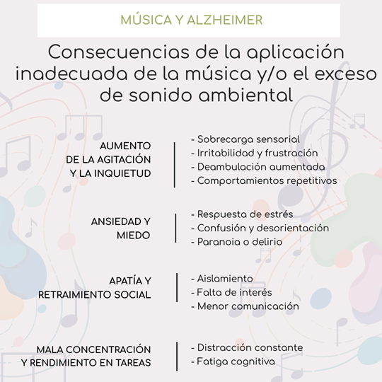 Las consecuencias de una aplicación inadecuada de la música en personas con alzhéimer pueden ser significativas y contraproducentes, afectando negativamente su bienestar conductual y emocional. En lugar de ser una herramienta terapéutica, la música mal utilizada puede convertirse en un estresor o un catalizador de comportamientos desafiantes. Juntamente con los ruidos ambientales, se han realizado algunos estudios que afirman que el sonido fue un predictor significativo de agitación. La acumulación de sonido predijo comportamiento agitado (van den Bosch et al., 2016). Los hallazgos sugieren que la agitación puede ser una pista de que el sonido en el ambiente está causando estrés para los residentes con demencia (Laura et al. 2012; Fleiner et al. 2020; van der Steen et al. 2021). El ruido puede contribuir a alteraciones del sueño, estrés oxidativo e inflamación y empeorar síntomas; en contraste, paisajes sonoros adecuados pueden reducir agitación —la línea entre beneficio y perjuicio depende del diseño/volumen/selección (Han et al. 2021; Ramos-de-Miguel et al. 2024).