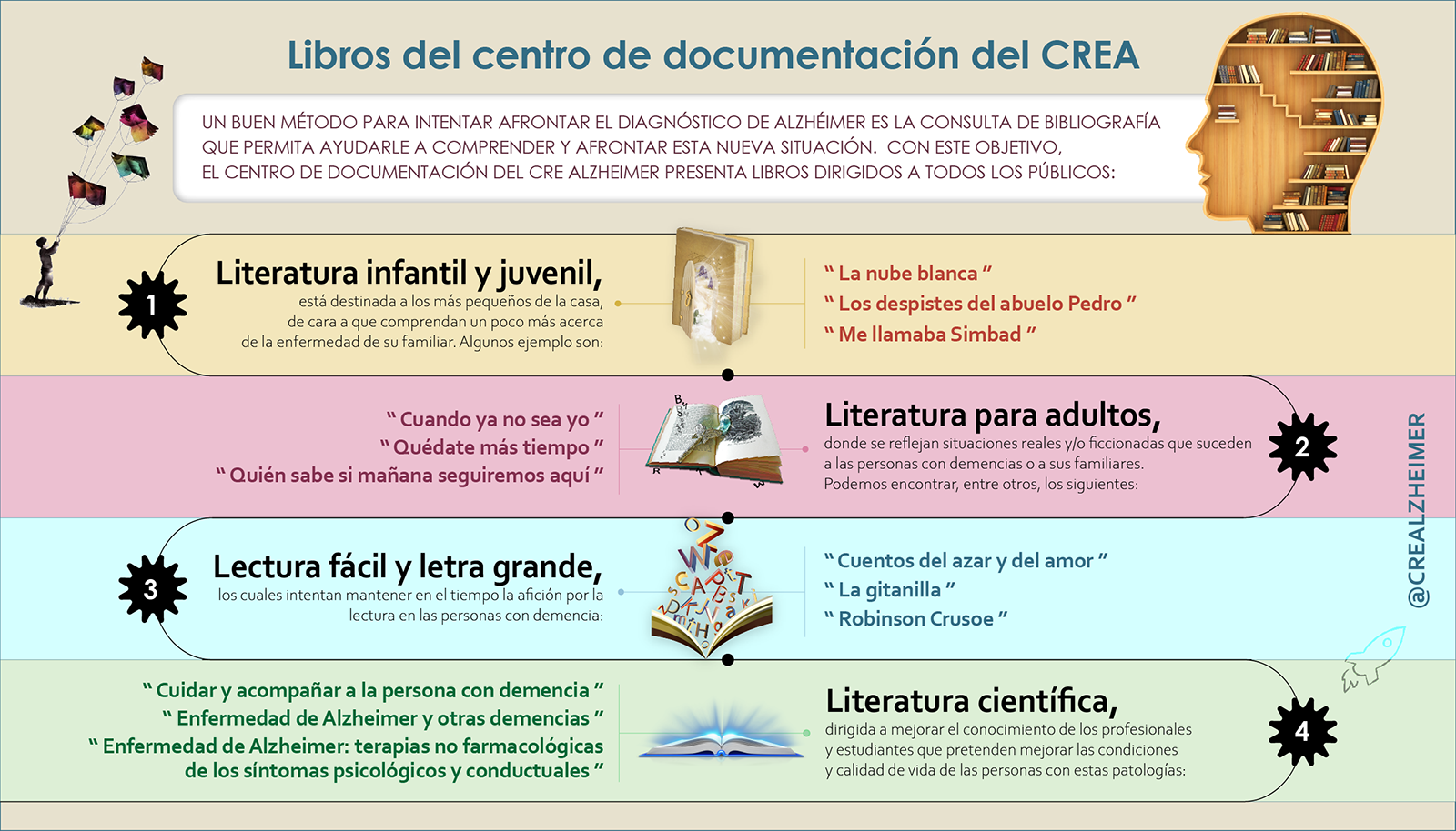 Desde el lunes se expusieron y difundieron a través de las redes sociales del centro un conjunto de títulos de la colección del centro de documentación sobre «lectura fácil», «libros, bibliotecas y literatura», «cine, documentales y alzhéimer», «literatura infantil y juvenil», «para cuidadores» y «sobre alzhéimer». Estos libros se mantendrán hasta el viernes 5 de mayo.